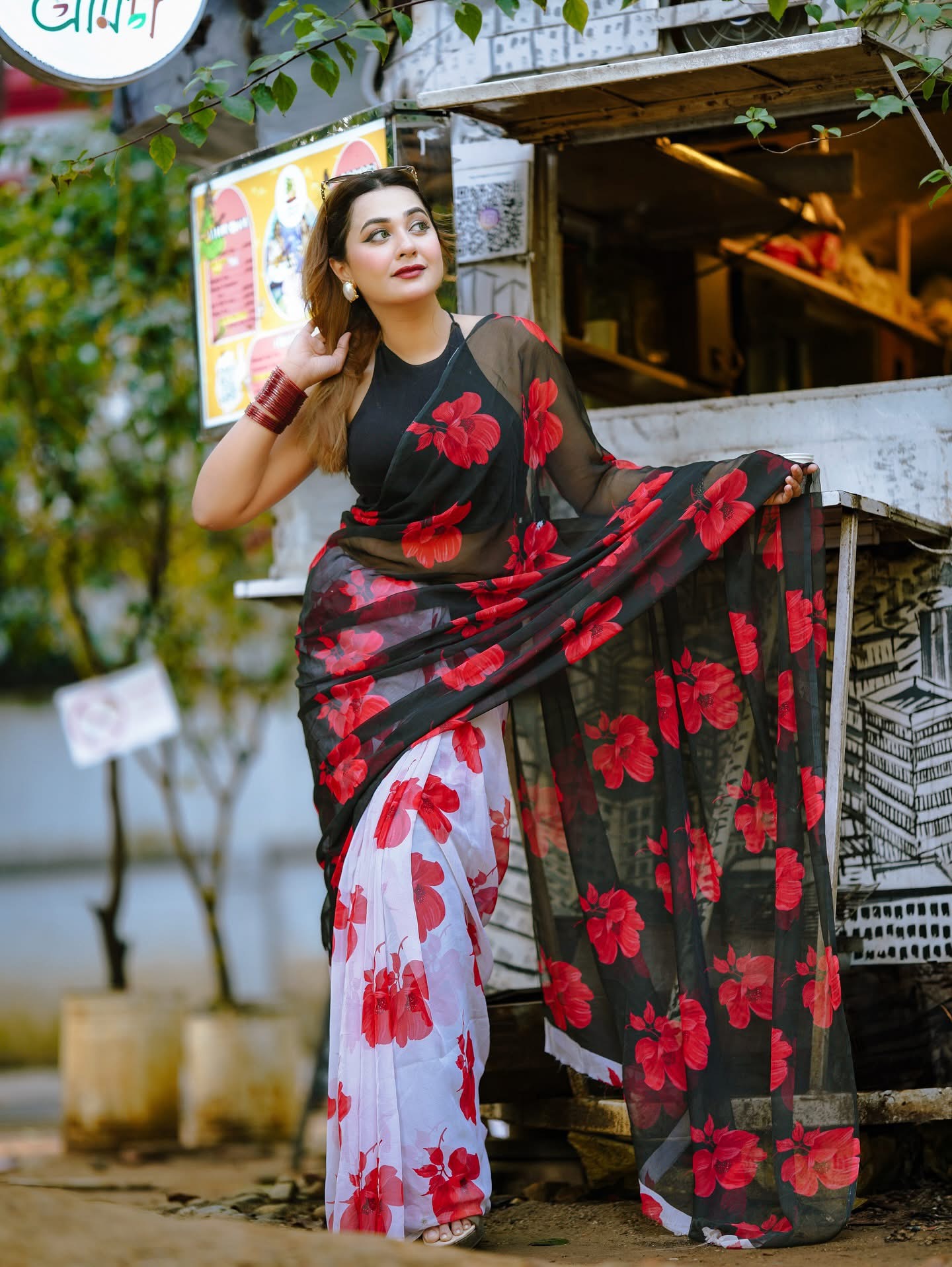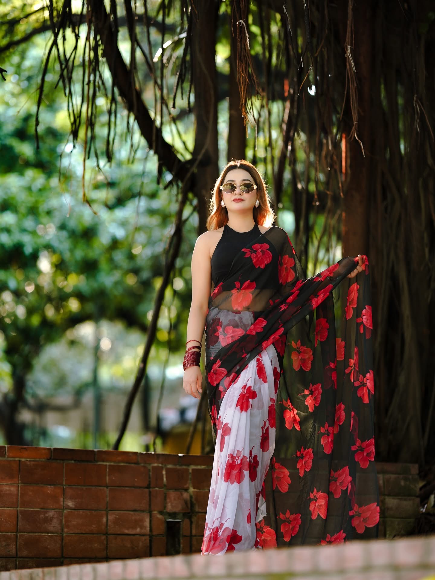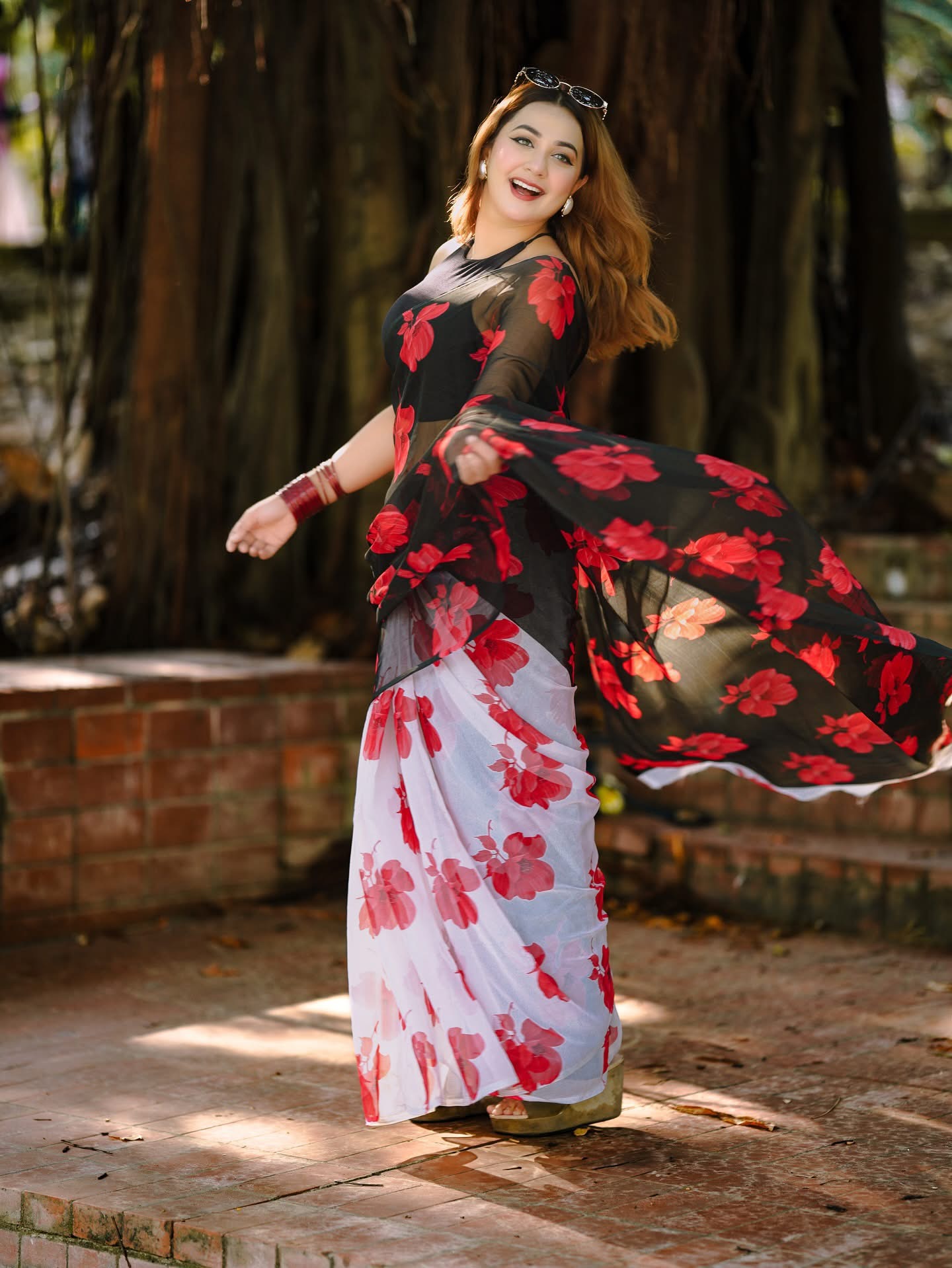 Black and white semi Moslin silk Floral Print Saree | DG-151