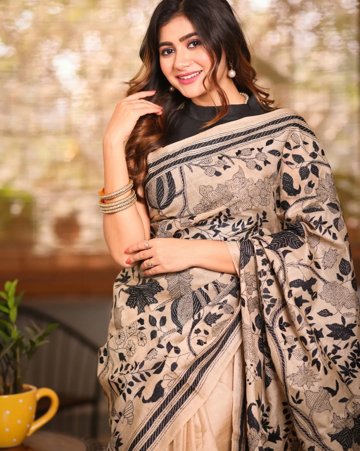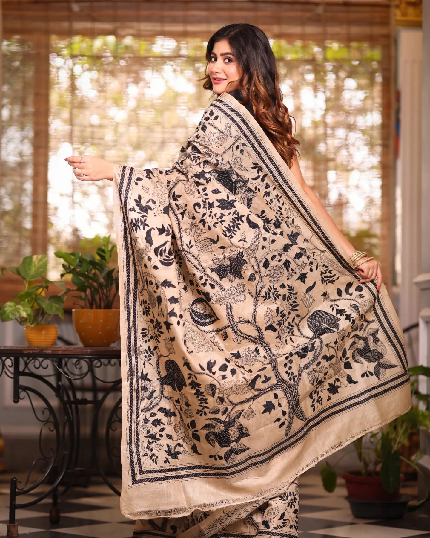 Cream Digital Print Pure Silk Saree With Blouse Piece | DG-218