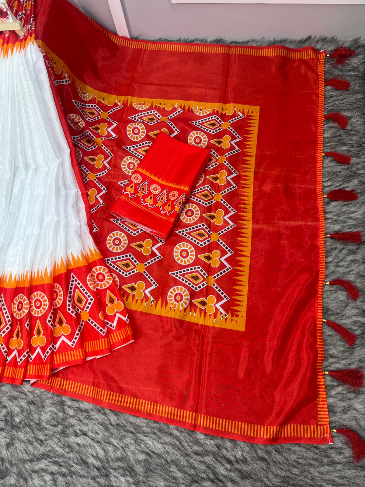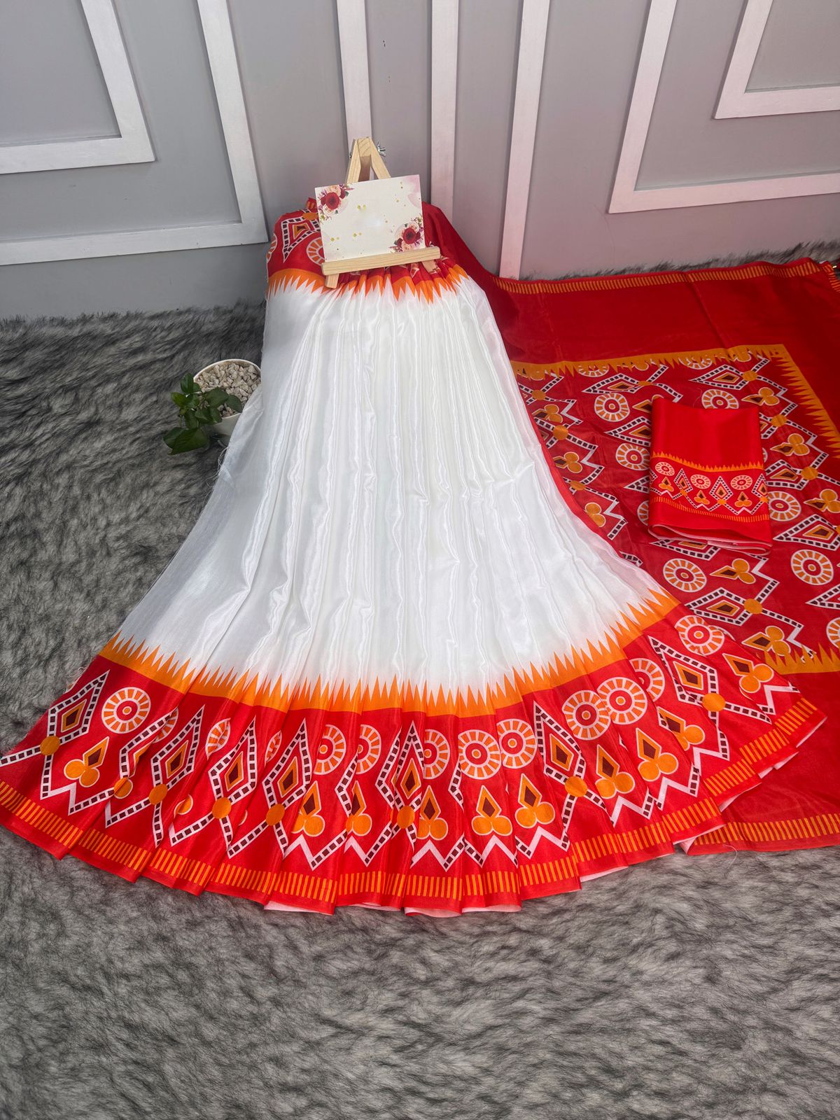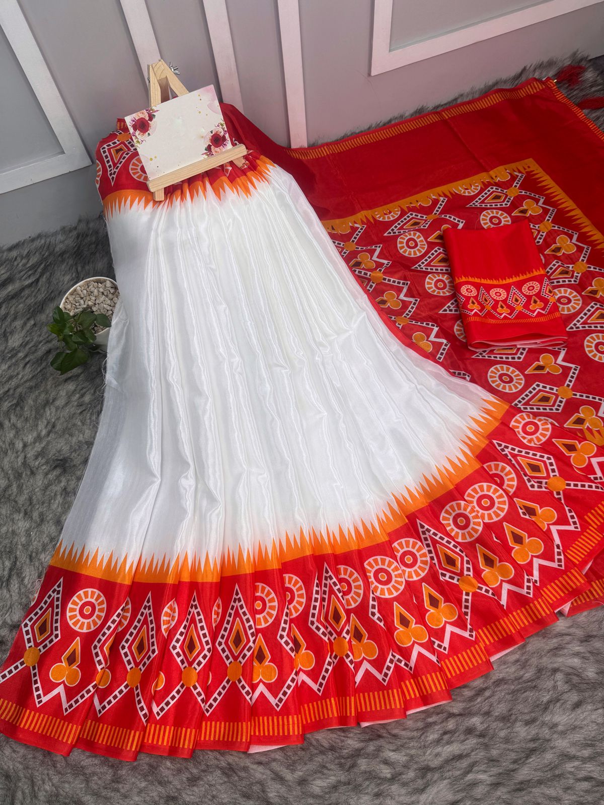 White and Red Soft Silk Digital Print Saree With Blouse Piece | DG-157